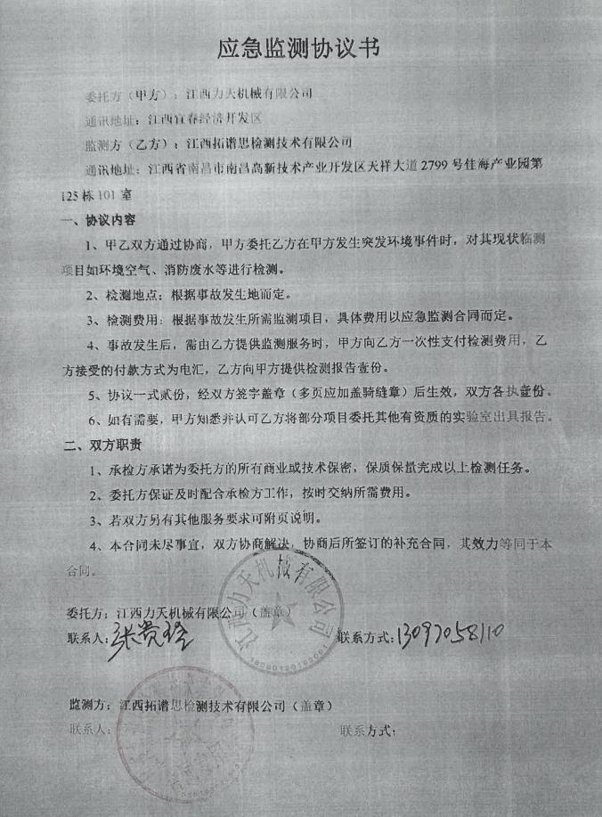2)保持突發(fā)環(huán)境污染事件應(yīng)急專項資金庫資金充足。根據(jù)江西力天機械有限公司目前的實際情況,保持每年投資約5-8萬元,作為日后應(yīng)急物資的更新儲備、應(yīng)急預(yù)案的演練、突發(fā)環(huán)境事件搶險救援使用。