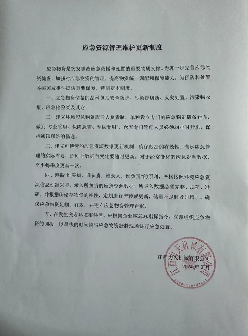 人力:江西力天機械有限公司成立了由工作人員組成的內(nèi)部應(yīng)急救援隊伍,后續(xù)通過加強對職工環(huán)境風(fēng)險和環(huán)境應(yīng)急管理宣傳、培訓(xùn)及演練后,可滿足應(yīng)急的需求。